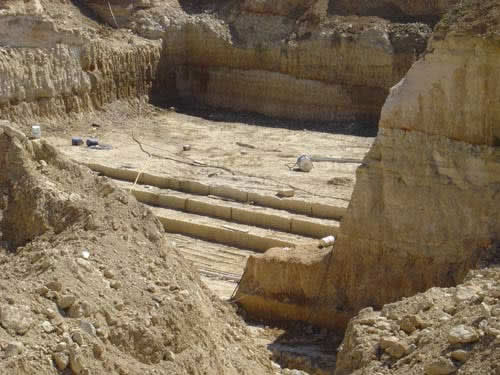 Para iniciar las labores en una nueva cantera se comienza retirando el manto de vegetación y tierra que cubre la roca. A continuación se realizan catas para determinar la calidad y detectar fallos e imperfecciones de la roca.